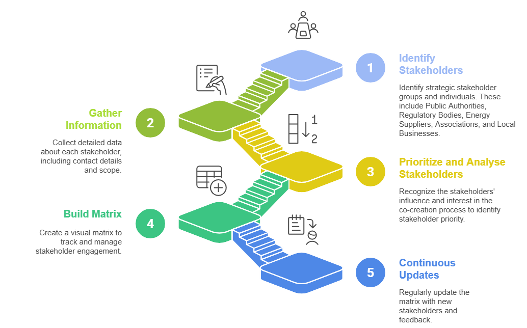 The stakeholder matrix for PLENTY-Life intends to identify strategic stakeholders (mainly at the municipality and region level) to be involved in the process of creating long-term energy and climate strategies for the pilot municipalities. These include Public Authorities, Regulatory Bodies, Energy Suppliers, DSOs, ESCOs, Funding Agencies, Social Institutions/Associations, Commerce Associations, and Local Businesses. Additionally, it fosters a deeper understanding of stakeholders and their roles, ensuring the establishment of effective collaboration methods for project success.